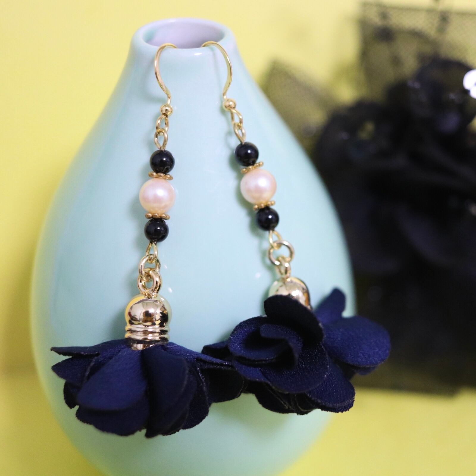 濃い目のネイビーカラーなタッセルフラワーピアス