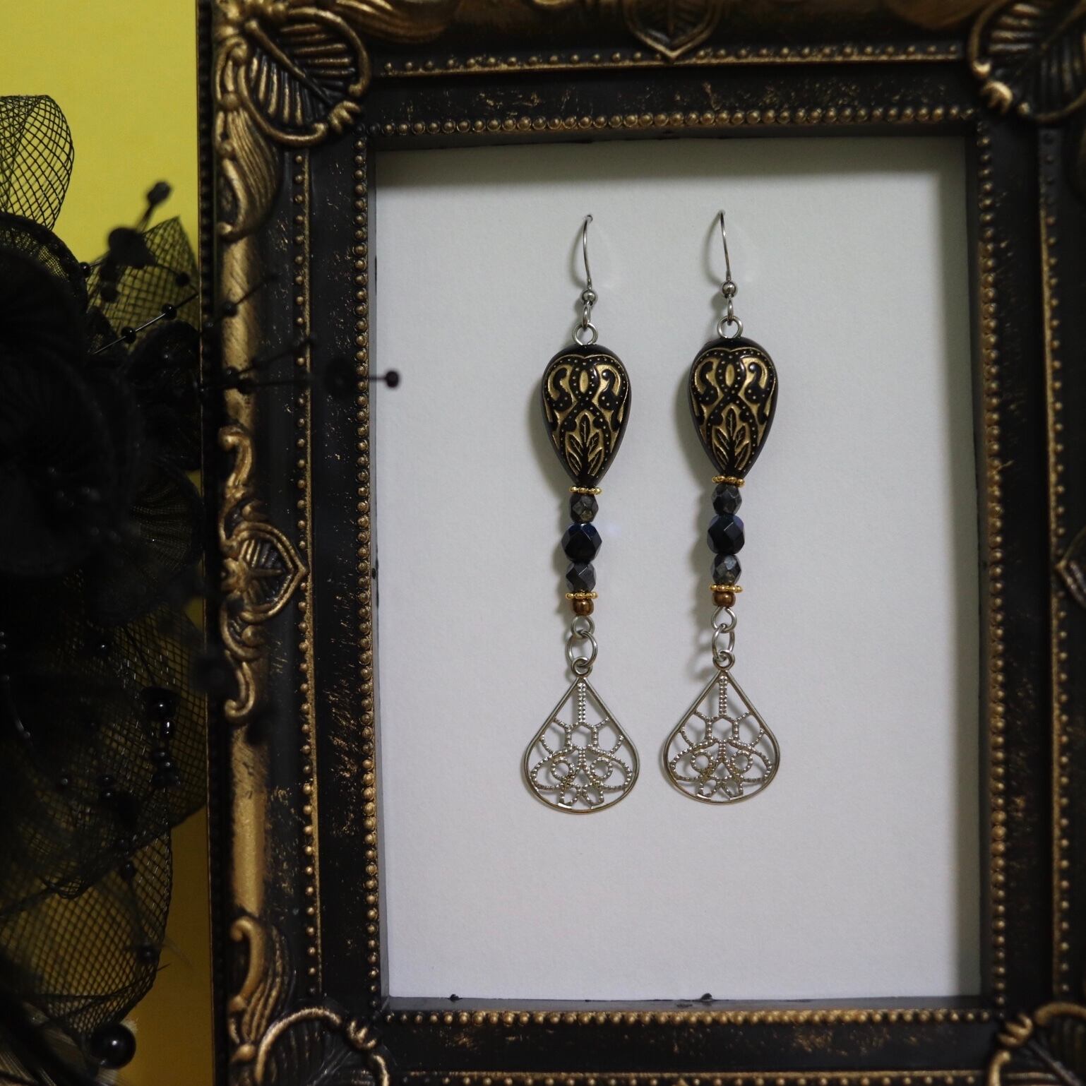 個性的な模様入りビーズが特徴的ながら、シックで使いやすいブラックカラーなピアス
