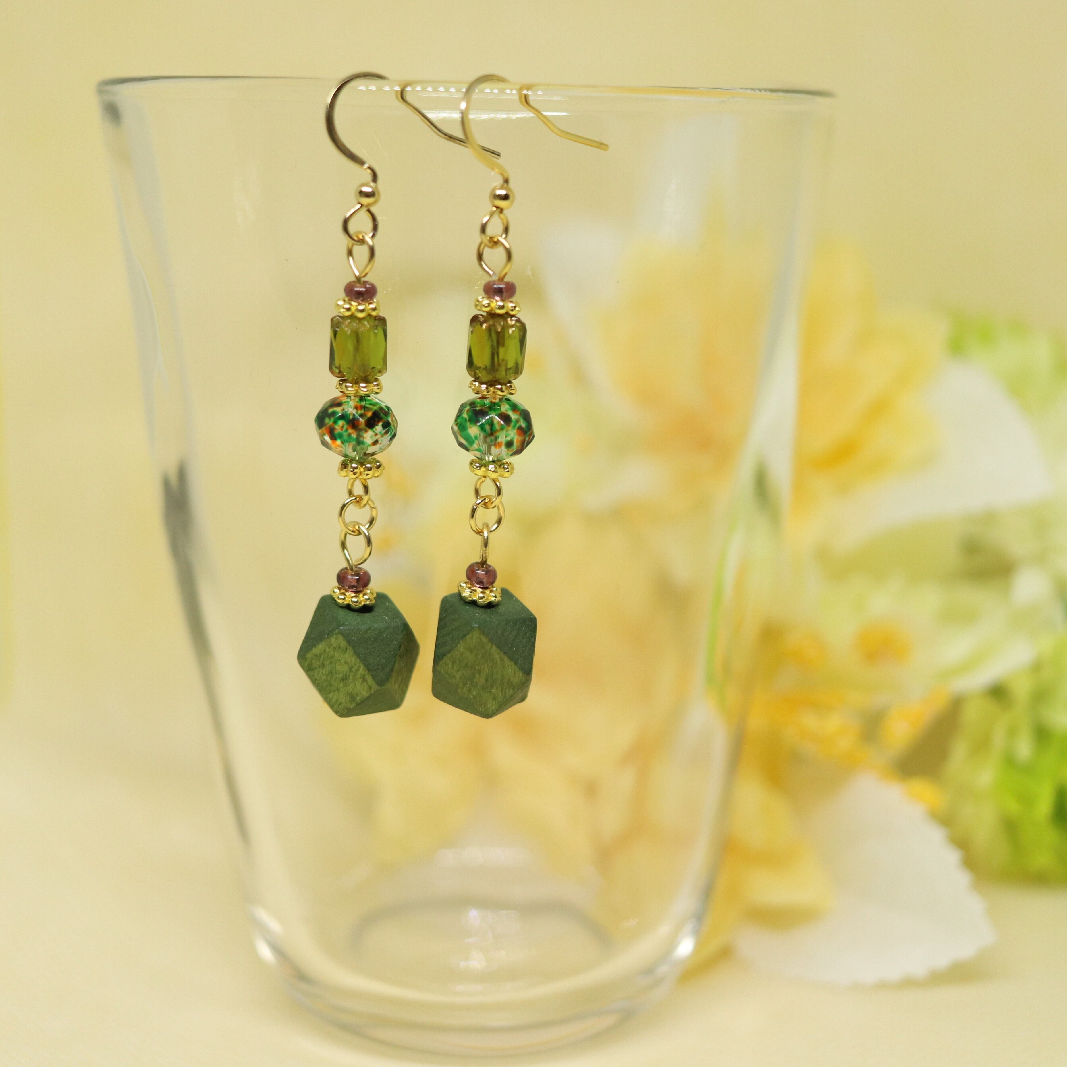 【ピアス・イヤリング】木製ビーズ・グリーン[Y70]