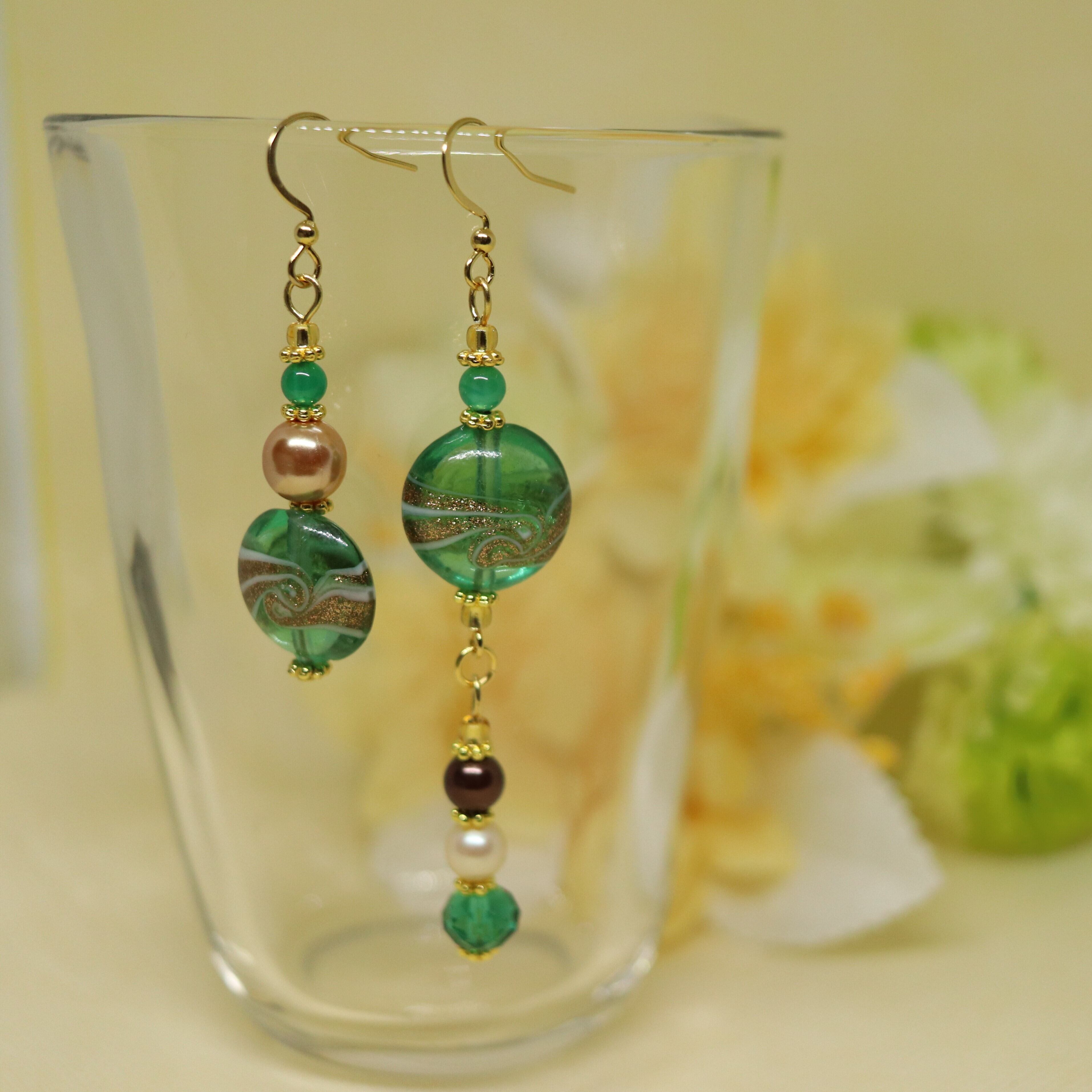 GR01【ピアス・イヤリング】シンメトリー・トンボ玉・グリーン